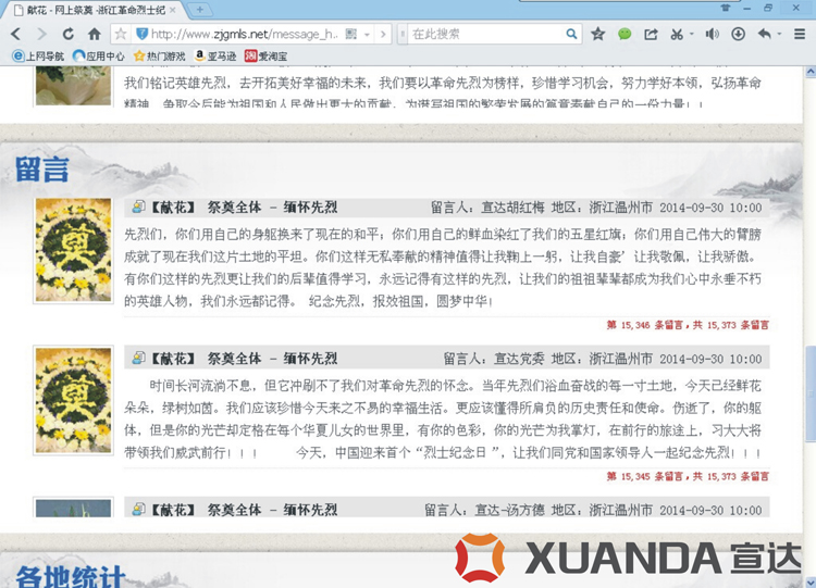 当日上午10:00,员工们登陆中共浙江省委宣传部、省民政厅等单位主办的浙江革命烈士纪念馆官方网站,在庄严肃穆的网站背景音乐声中,向革命烈士点亮蜡烛,赠送鲜花,并在网站上了解了革命战争年代的历史风云,学习了革命先烈浴血奋战的英勇事迹。他们有的献花,有的献歌、献烛,有的以短信寄心情。有的在上面留言:“当年先烈们浴血奋战的每一寸土地,今天已经鲜花朵朵,绿树如荫。我们应当珍惜来之不易的幸福生活,更应该懂得所肩负的历史责任和使命”,有的留言:“纪念先烈,报效祖国,圆梦中华,为祖国的崛起而奋斗”,还有的赋诗:“志士成仁洒热血,换得乾坤正气绵。华夏儿女多壮志,中华梦园谱新篇”……等等,众多深情的话语表达了员工们的崇敬和感恩心情。