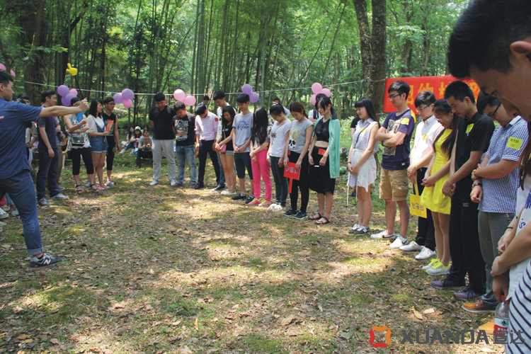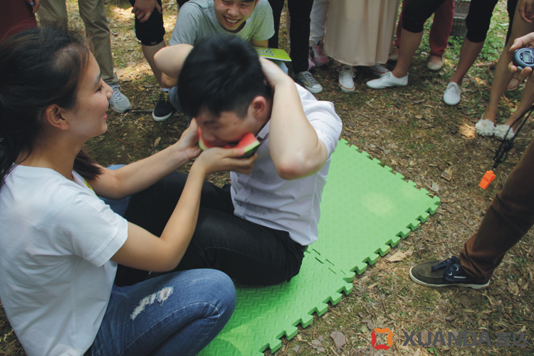 “请大家排好队伍,围成一个圈……”个人游戏“一元五角”在主持人的带动下开始了。游戏分两轮,每组每轮派 4 人参加( 2 男 2 女),男生代表一元,女生代表五角。游戏开始放音乐,大家围成一个全圈往前走。音乐停止,主持人报一个金额。所有人要在最短时间内组队,凑足金额,落单的人淘汰,比赛结果记入个人的成绩中。这场游戏让大家精神高度紧张,笑声此起彼伏。