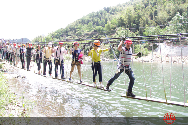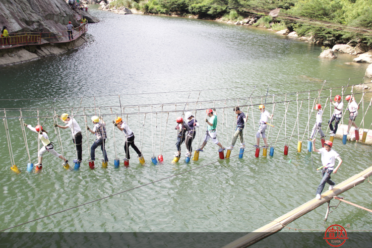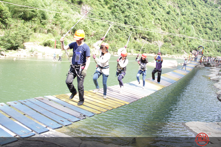 九鲤溪位于太姥山岳景区西南侧,景区内乌杯峡谷运动户外乐园为目前国内最大的景观级户外(拓展)培训基地,素有“中国养生运动第一溪”之誉。景区设有缅甸桥、携手并进、抽板过河、飞檐走壁、飞夺泸定桥、滑索过涧、水上飞、高空溜索、浮桩桥、荡绳过河、凌空漫步等十三项有趣而刺激的峡谷游玩项目。其中“缅甸桥”仿造缅甸热带丛林中的索桥,桥罩在网中,人过桥时如丛林历险;“携手并进”则是协作性的项目,两人在举步维艰中,必须互相帮助,默契配合,共荣共生;“抽板过河”板离水面不高,交接板时需脚踩准板,手抓准绳;“滑索过涧”在溪涧的另一侧,需要挑战者放下恐惧,勇敢地纵身一跃,耳旁是呼啸的山风;“浮桩桥”须双手紧握摇晃的绳索,脚下小心翼翼踩好每一个浮桩,可谓步步惊心……这些活动不但要求挑战者具备一定的心理素质,而且考验团队的协作能力,没有被困难所吓倒的华体(中国)勇士们硬是通过了一个又一个惊险的项目。活动中也充满了团队相处的和谐与欢乐,如“滑索过涧”中成功挑战的同事需躲避先前已到达彼岸的同事“泼水之厄”,“荡绳过河”中有些身手矫捷的男生明明成功过河了却被对岸的同事推了回去,“凌空漫步”中一些男生故意调皮地将身子往左右倾斜企图让人失去平衡,现场不时传起惊叫声和阵阵欢笑声……